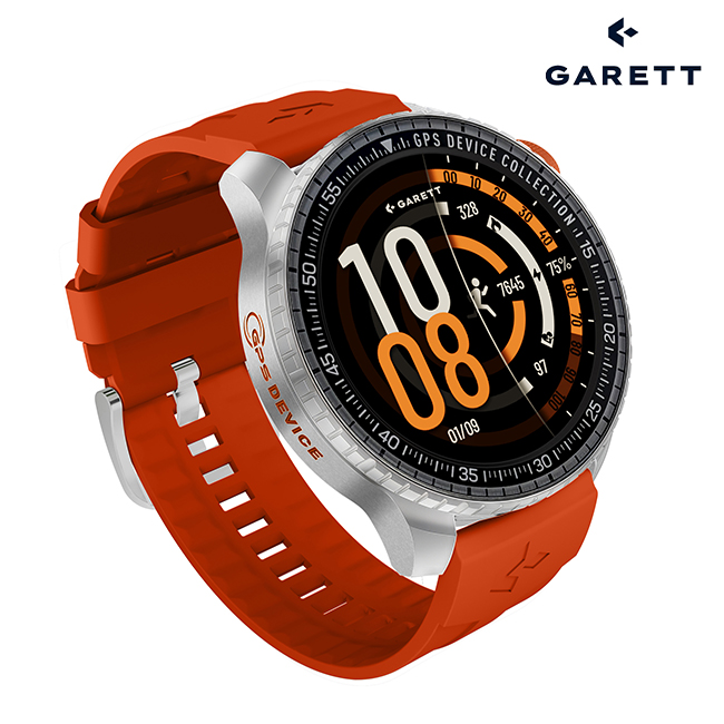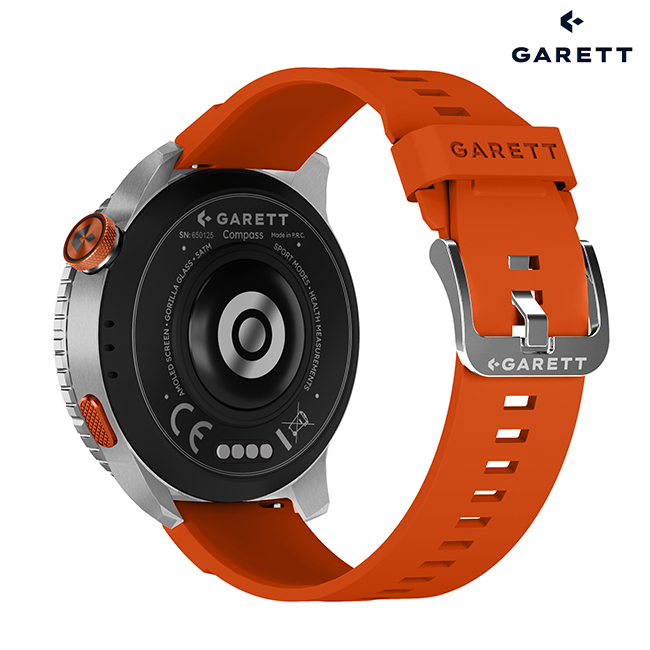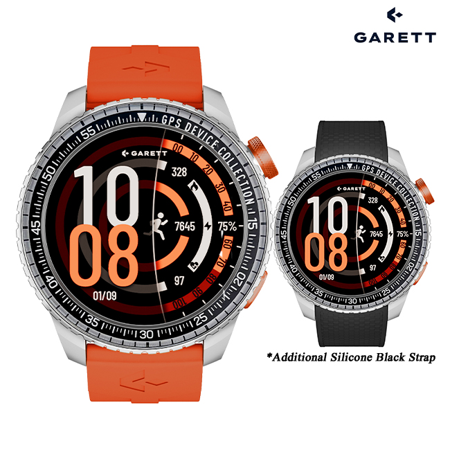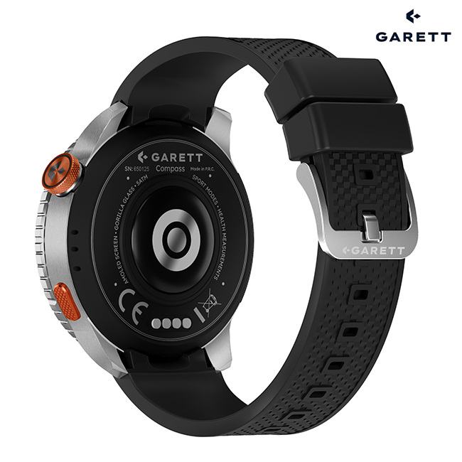 The Garett Compass is available in two versions: with a silver case and orange strap, or with a black case and green strap. Each set includes comfortable black silicone straps that combine durability with comfort.