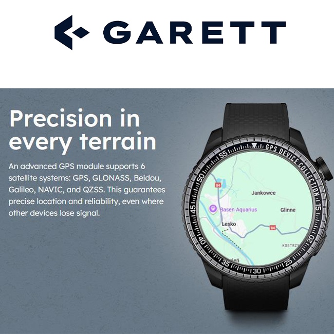 The Garett Compass smartwatch is equipped with a precise GPS module that supports six satellite systems: GPS, GLONASS, Beidou, Galileo, NAVIC, and QZSS. Thanks to broad signal compatibility, the device ensures accurate location and stable operation even in hard-to-reach areas where other devices often lose coverage.