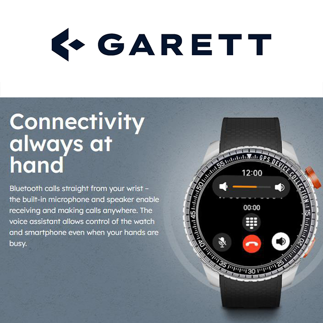 The Garett Compass is equipped with a microphone and speaker that allow you to make calls via Bluetooth directly from your wrist. A built-in voice assistant makes it easy to control smartwatch and smartphone functions, ensuring comfort even during intense activity.